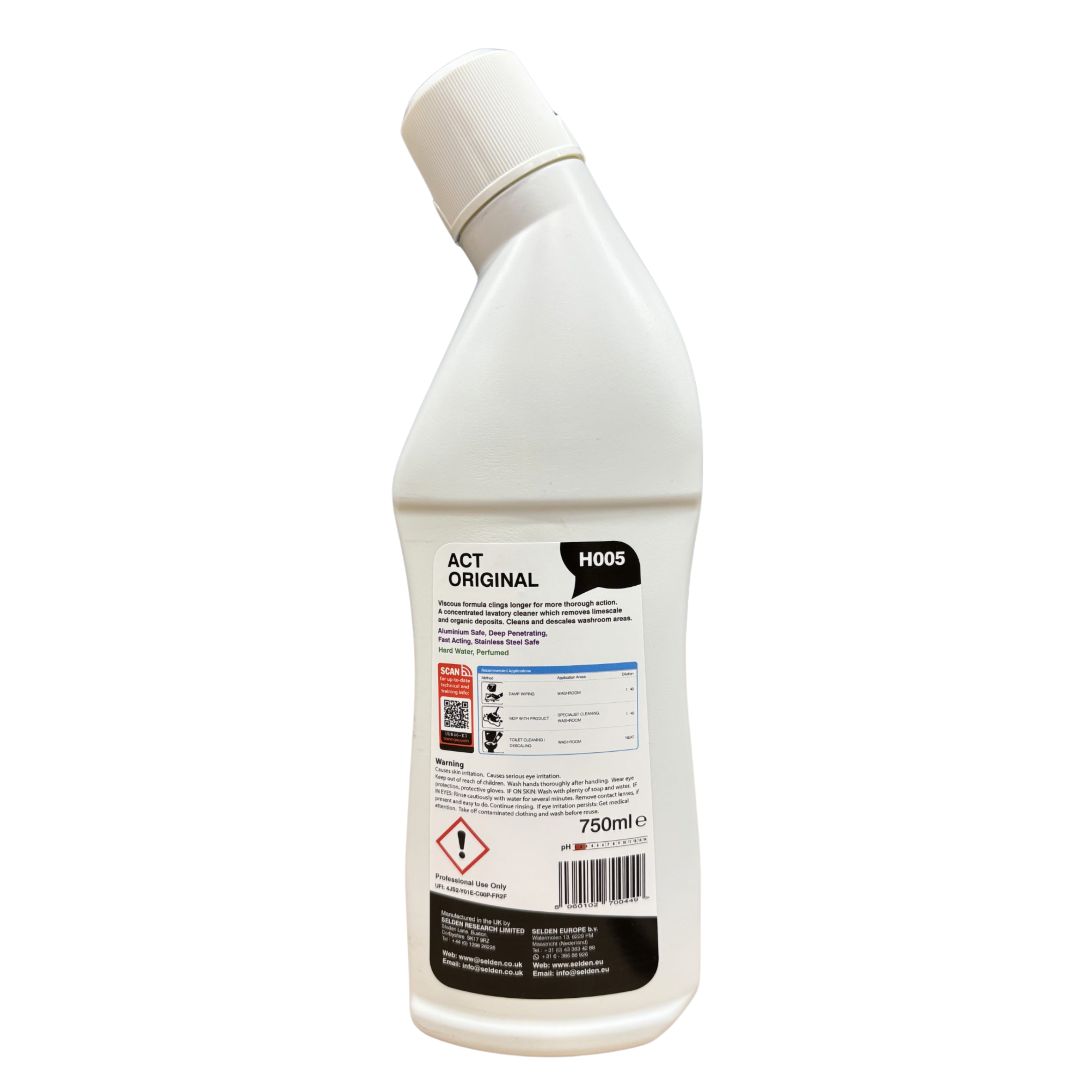750ml viscous toilet cleaner designed to cling longer for thorough cleaning action. Concentrated formula removes limescale and organic deposits, effectively cleaning and descaling washroom areas.