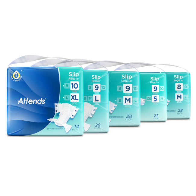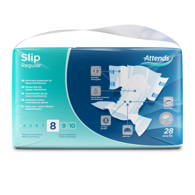 Attends Slip Regular are all-in-one products designed to manage heavy urinary and/or faecal incontinence. The adjustable tapes are designed to provide a close and comfortable fit to minimise leakages. Feel confident in a secure fit with four adjustable tabs. This pad is designed for men and women with little to no bladder and/or bowel control. Can be used for night-time incontinence. Can be used for night-time incontinence and bedwetting. An alternative for children.