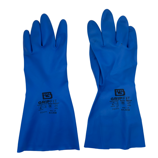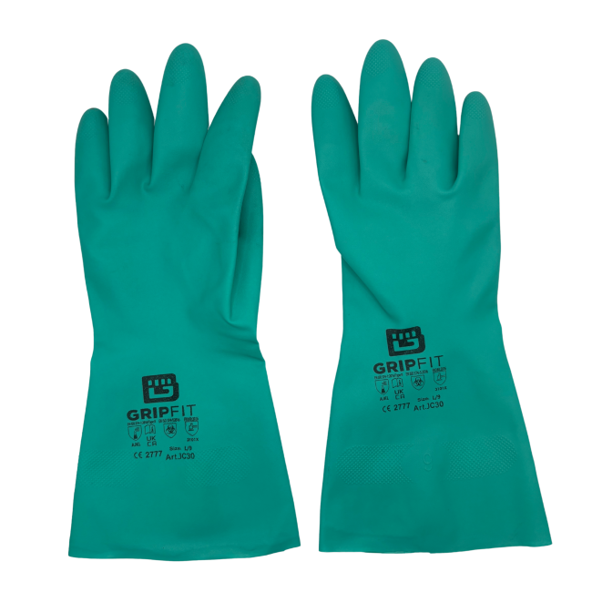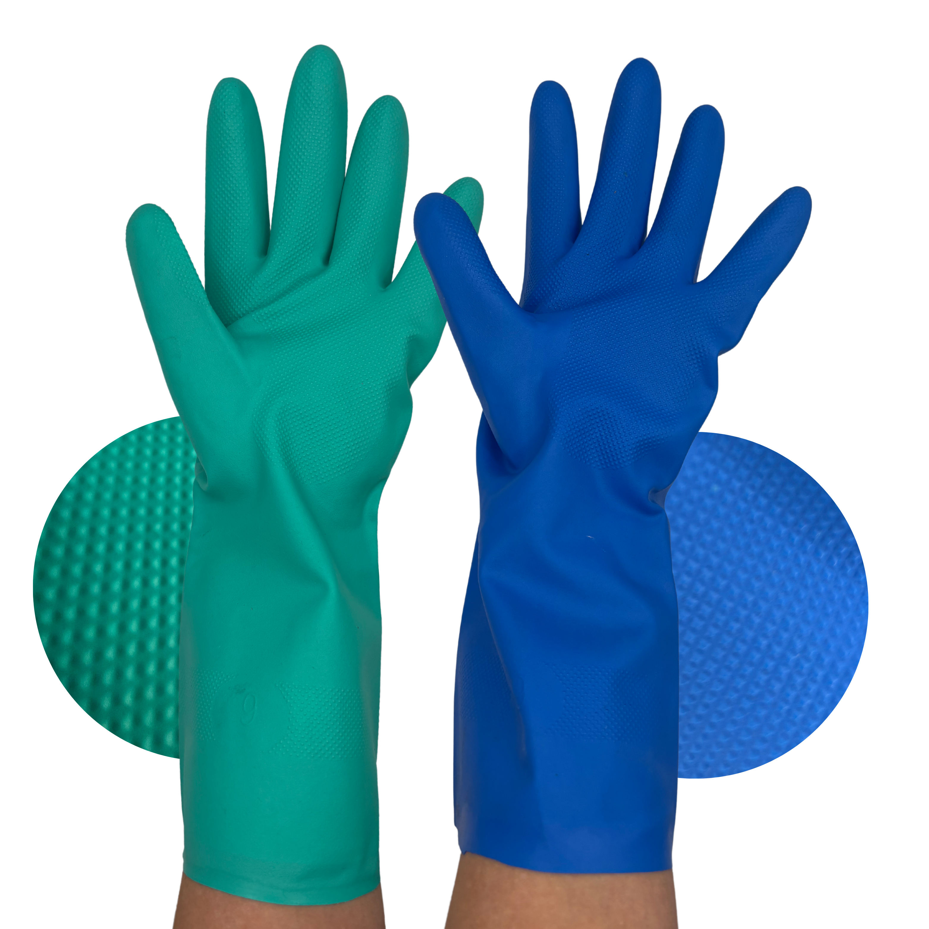 Our dual-layer nitrile gloves offer superior performance and protection for demanding industrial environments. Designed as an allergy-free alternative to traditional latex gloves, they provide excellent resistance, grip, and comfort—making them ideal for industrial cleaning and a wide range of professional applications. Featuring a two-layer construction —a durable outer nitrile rubber layer and a white inner nitrile layer—these gloves are treated with a chlorinated surface for enhanced chemical resistance and easier donning. The pure flock-lined interior ensures comfort during extended use, while the diamond-embossed grip pattern delivers secure handling in both wet and dry conditions. Available in blue and green.