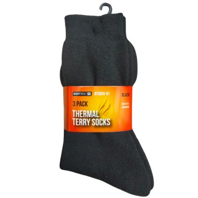 Prepare for the cooler months ahead with Bodytech Thermal Terry Socks. These black socks come in a convenient pack of 3 pairs, ensuring you always have a fresh pair ready to go.