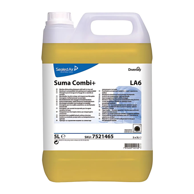 - Suma Combi+ LA6 is a combined concentrated liquid mechanical ware washing detergent and rinse aid in one, specially formulated to provide soil removal at a water hardness of 215ppm.