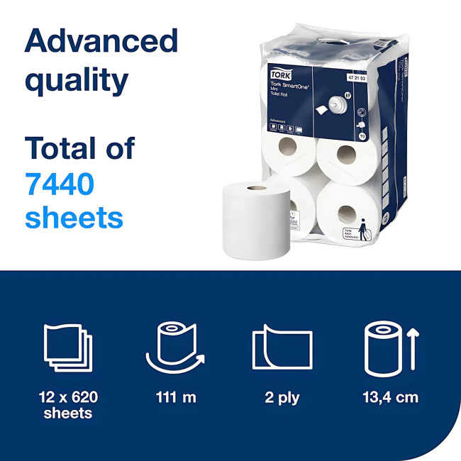 The Tork SmartOne Mini Toilet Roll System uniquely delivers one hygienic sheet at a time, helping to reduce consumption by up to 40% compared to traditional jumbo roll dispensers, which means more visits per roll. Tork SmartOne Mini high-capacity rolls are suitable for demanding washrooms from low to medium to high traffic, depending on which Tork SmartOne Mini dispenser is chosen.